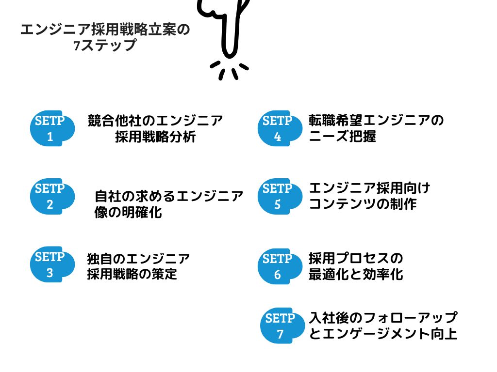 エンジニア採用戦略を立てる際には、体系的なアプローチが必要です。ここでは、7つのステップを踏まえて、効果的な採用戦略を立案する方法を紹介します。